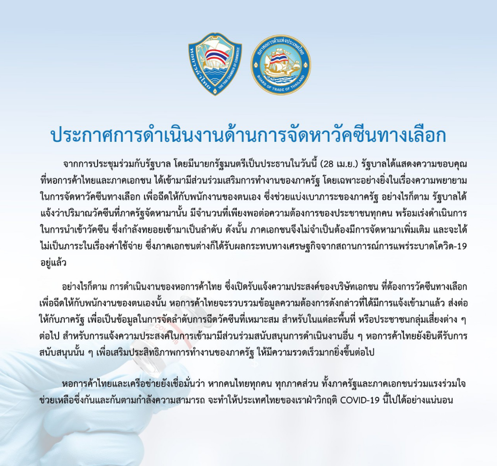 พร้อมระบุว่า ที่ผ่านมารัฐอาจให้ความสำคัญกับการดูแลด้านสาธารณสุขเป็นหลัก ครั้งนี้จึงอยากให้รัฐหันมาดูแลเรื่องเศรษฐกิจควบคู่ไปด้วย โดยเฉพาะรูปแบบการจัดสรรวัคซีน ซึ่งถือเป็นความหวังเดียวของภาคธุรกิจในขณะนี้