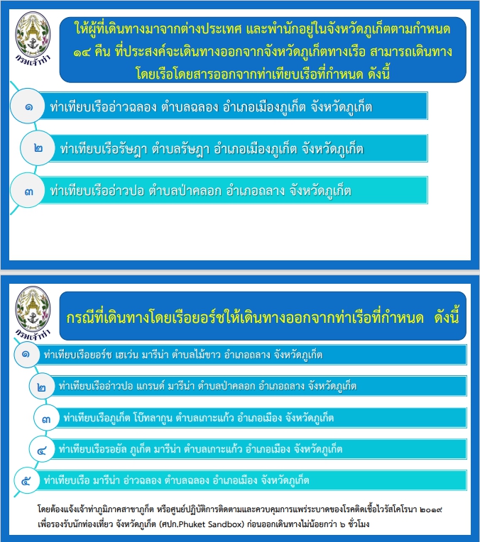 14 คืน ที่ประสงค์จะเดินทางออกจากจังหวัดภูเก็ตทางเรือ ให้เดินทางผ่านท่าเรือที่กำหนดเป็นด่านตรวจทางน้ำเท่านั้น แต่ในกรณีเดินทางโดยเรือยอร์ชให้เดินทางออกจากท่าเรือที่กำหนด ดังนี้
