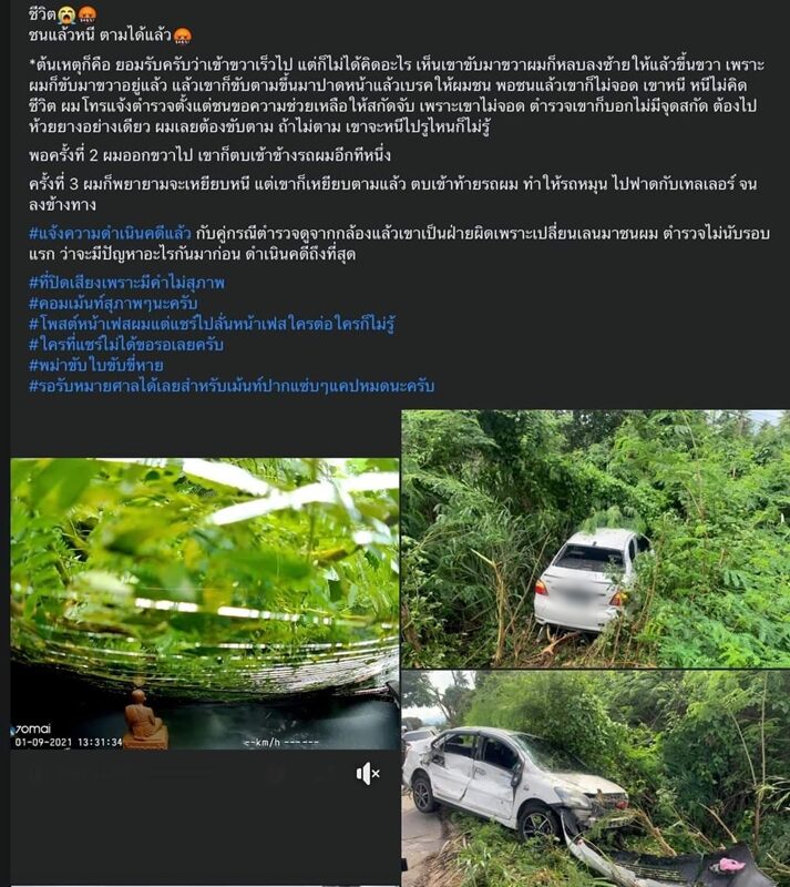 ล่าสุดเจ้าของคลิปได้โพสต์ข้อความผ่านเฟซบุ๊กถึงเรื่องราวที่เกิดขึ้น โดยระบุว่า “ชีวิต ชนแล้วหนี ตามได้แล้ว ต้นเหตุก็คือ ยอมรับครับว่าเข้าไปขวาเร็วไป แต่ก็ไม่ได้คิดอะไร เห็นเขาขับมาขวาผมก็หลบลงซ้ายให้แล้วขึ้นขวา เพราะผมก็ขับมาขวาอยู่แล้ว แล้วเขาก็ขับตามขึ้นมาปาดหน้าแล้วเบรกให้ผมชน