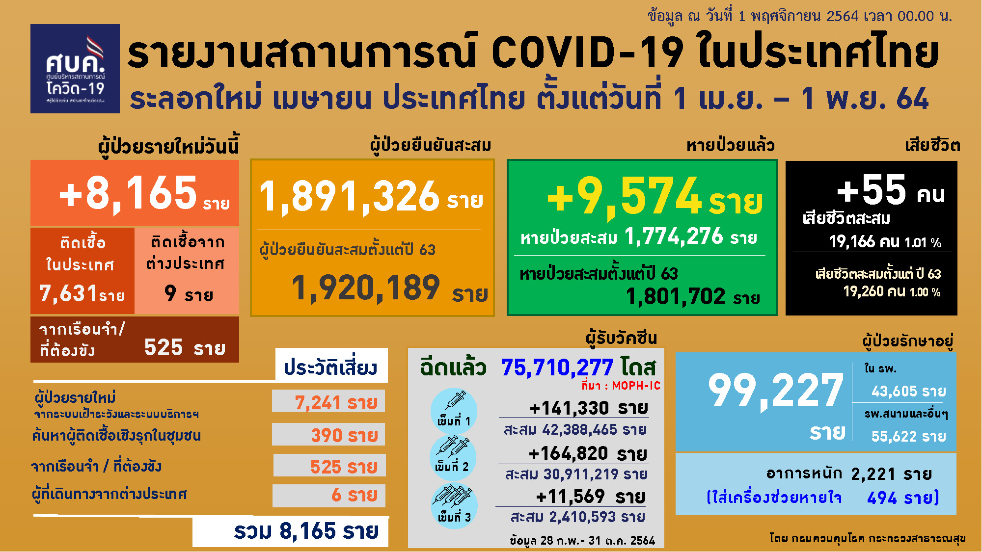 ส่วนผู้ขอรับการฉีดวัคซีน ณ วันที่ 31 ตุลาคม 2564 มีผู้รับการฉีดวัคซีนเข็มที่ 1 จำนวน 141,330 ราย เข็มที่ 2 จำนวน 167,820 ราย และเข็มที่ 3 จำนวน 11,569 ราย และระหว่างวันที่ 28 กุมภาพันธ์ – 31 ตุลาคม 2564 มีผู้รับวัคซีน สะสมทั้งหมด จำนวน 75,710,277 โดส