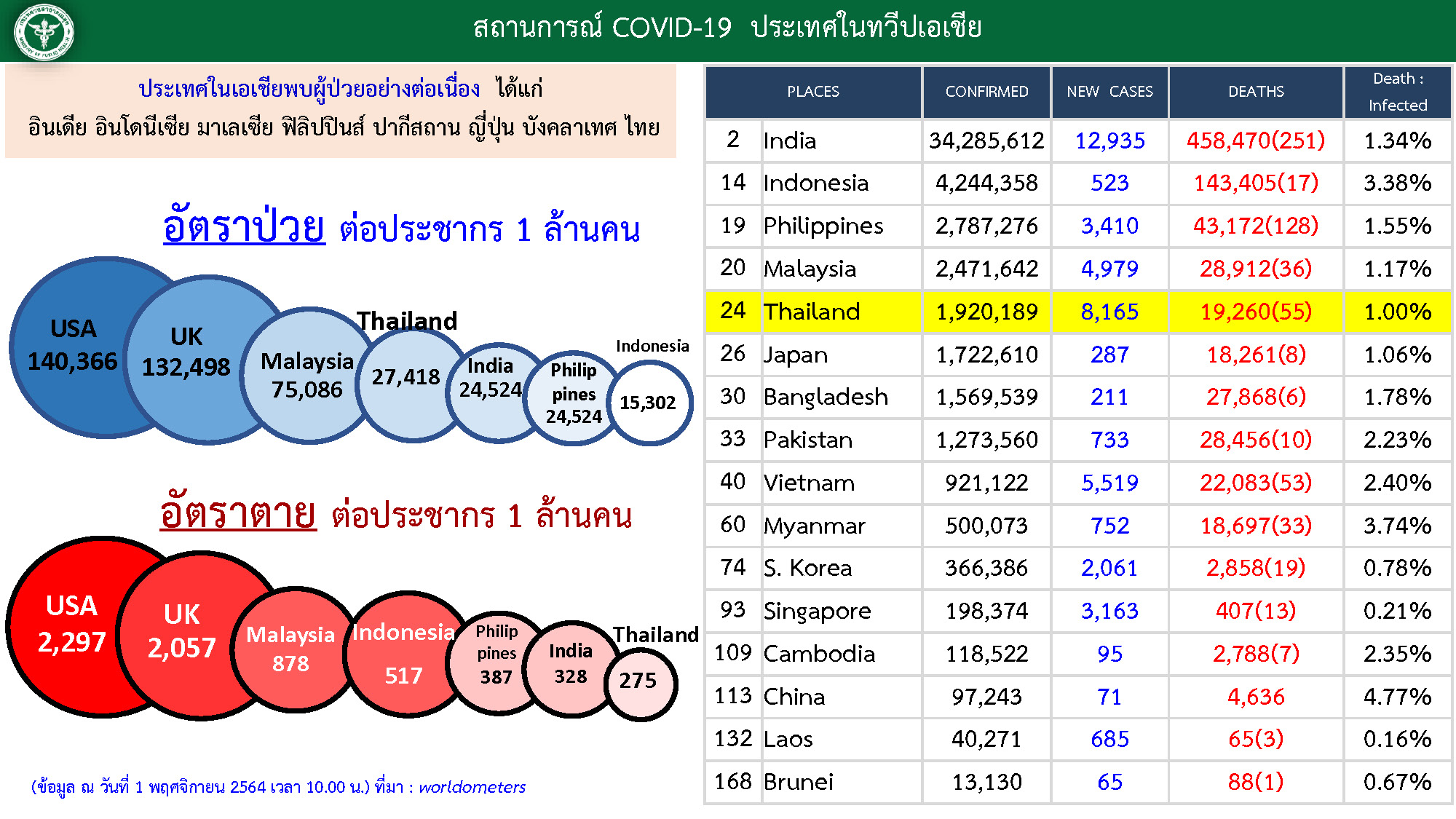 ประเทศไทย อยู่ในอันดับที่ 24 ของโลก จากจำนวนผู้ป่วยยืนยันสะสม 1,920,189 ราย