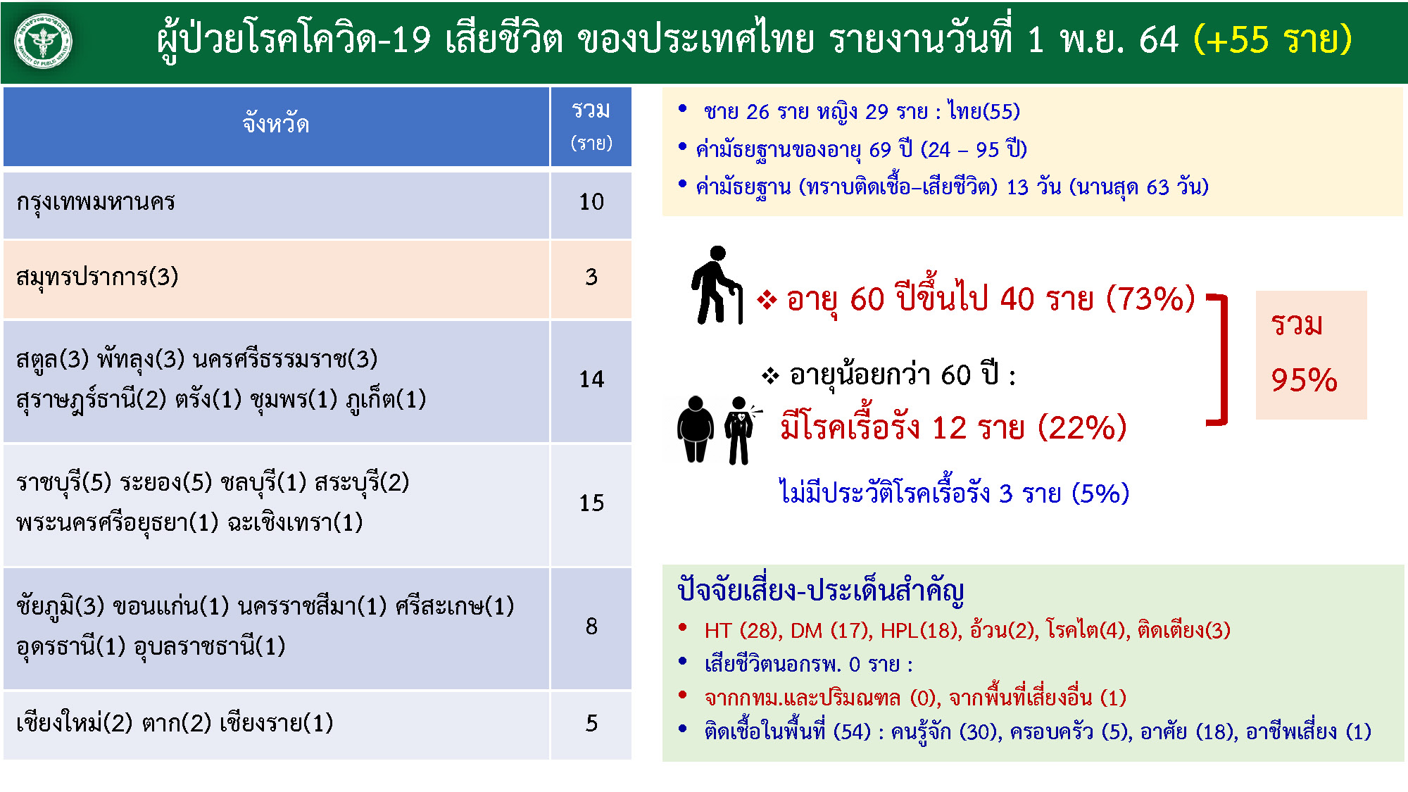 สำหรับผู้เสียชีวิตเป็นวันแรกที่ไม่มีรายงานผู้เสียชีวิตจากจังหวัดชายแดนใต้ ส่วนตัวเลขสูงของวันนี้อยู่ที่ภาคกลางและตะวันออก เป็นราชบุรี ระยอง ชลบุรี สระบุรี อยุธยา และฉะเชิงเทรา กลุ่มนี้รวมกัน 15 คน และ กทม.มีรายงานผู้เสียชีวิตวันนี้ 10 คน สมุทรปราการ 3 คน