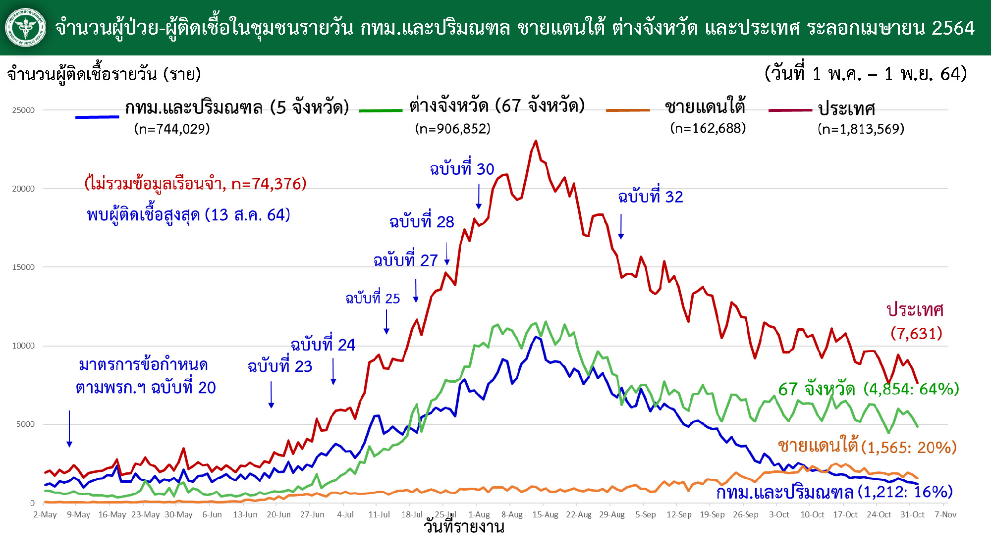 วันที่ 1 พฤศจิกายน 2564 แพทย์หญิงอภิสมัย ศรีรังสรรค์ ผู้ช่วยโฆษกศูนย์บริหารสถานการณ์โควิด-19 (ศบค.) แถลงสถานการณ์ประจำวันว่า วันนี้ตัวเลขผู้ติดเชื้อที่รายงานยังคงลดลงต่ำกว่าวันละหมื่นราย แม้ว่าตลอดเดือนตุลาคมจะมีการผ่อนคลายเป็นระยะ คงต้องขอบคุณพี่น้องประชาชนและสถานประกอบการที่ได้รับการผ่อนคลายที่ร่วมมือกัน ทำให้เห็นตัวเลขผู้ติดเชื้อ ที่ถือได้ว่าระบบสาธารณสุขยังรองรับได้ และวันนี้สิ่งที่สำคัญคือการเปิดประเทศต้อนรับนักท่องเที่ยวเป็นวันแรกด้วย