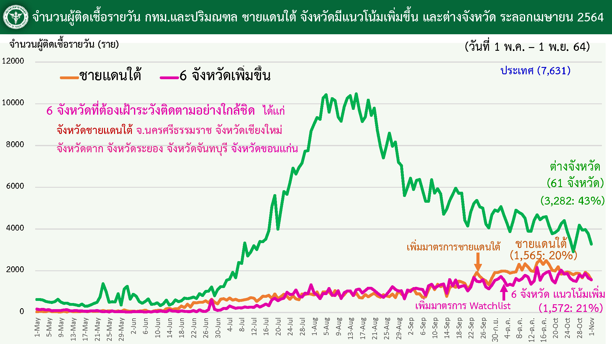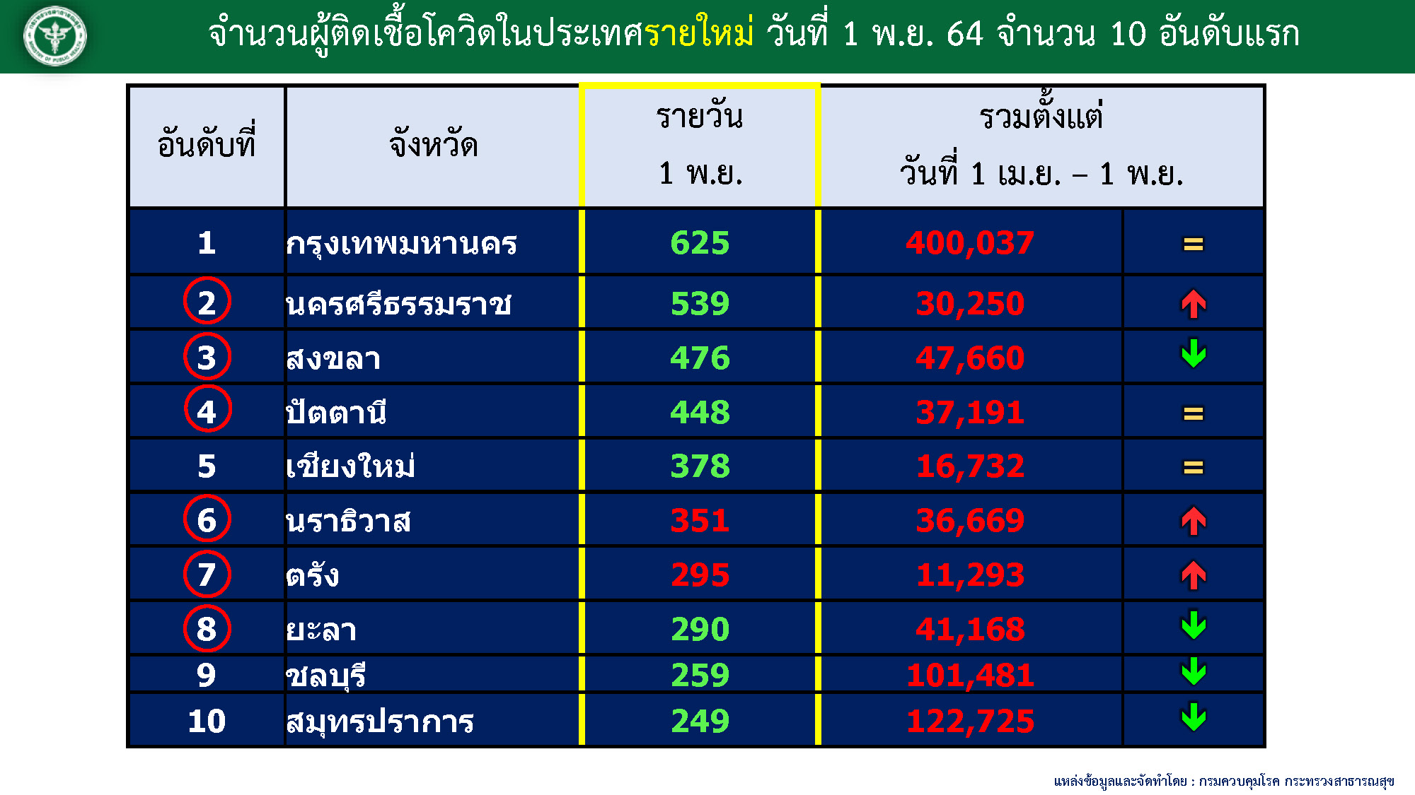 10 อันดับสูงสุดในวันนี้เป็นนครศรีธรรมราช อันดับ 3 สงขลา อันดับ 4 ปัตตานี แม้ว่าตัวเลขจะขึ้นมาเป็นอันดับ 2, 3 และ 4 แต่ทิศทางมีแนวโน้มลดลง ขณะที่ กทม.วันนี้ตัวเลขลดลงอย่างมาก เหลือ 625 ราย ส่วนจังหวัดที่ยังขึ้นเป็นสีแดงอยู่ (ตามตาราง) คือ นราธิวาส วันนี้มีรายงาน 351 ราย และตรัง 295 ราย ซึ่งมีทิศทางที่เพิ่มขึ้น