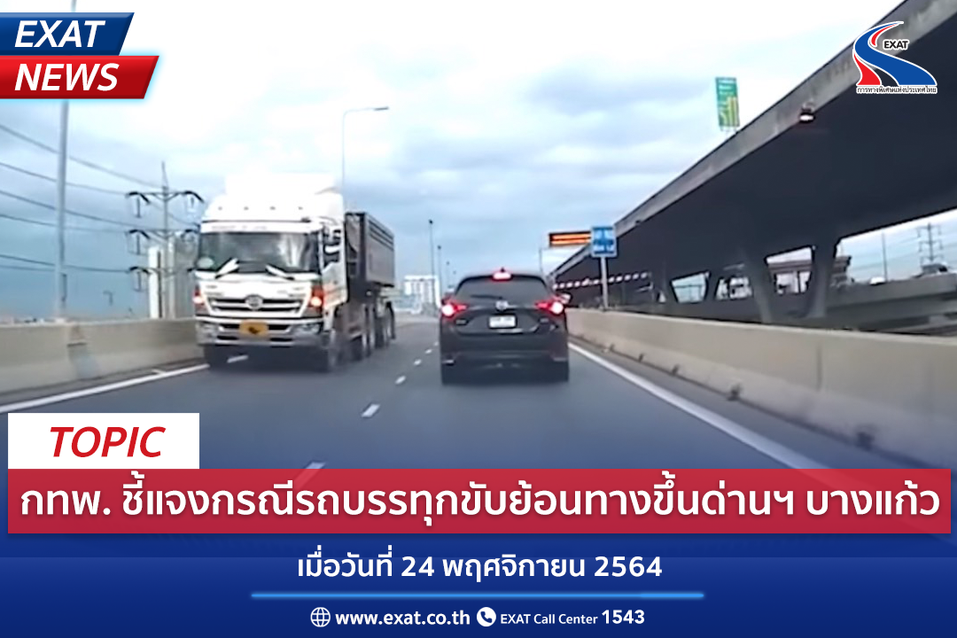 การทางพิเศษแห่งประเทศไทย (กทพ.) กระทรวงคมนาคม ขอเรียนชี้แจงว่า เมื่อเวลา 07.08 น. มีรถบรรทุกพ่วง 18 ล้อ ยี่ห้อ HINO สีขาว หมายเลขทะเบียนไม่ชัดเจน ขับย้อนทางขึ้นด่านฯ บางแก้ว กทพ. ได้ตรวจสอบภาพจากกล้องวงจรปิด พบว่ารถคันดังกล่าว ขับมาตามทางก่อนถึงด่านฯ บางแก้วในช่องขวา เพื่อจะใช้ U-Turn กลับรถมุ่งหน้าขาออกไปชลบุรี เมื่อรถคันดังกล่าวถึงจุดกลับรถจึงพบว่าไม่สามารถกลับรถได้เนื่องจากรถมีความสูงกว่าคานกั้น จึงทำการกลับรถย้อนกลับมาลงที่ทางเดิม ในเวลาประมาณ 07.11 น.