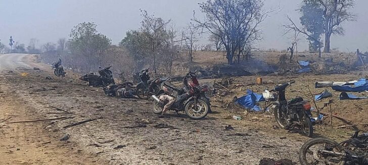 สำนักข่าวเอเอฟพีรายงานว่า เมื่อวันที่ 13 เมษายน ชาวบ้านได้ใช้ยางรถยนต์เก่าในการเผาประชาชนที่ถูกสังหาร จากการที่กองทัพเมียนมาโจมตีทางอากาศใส่หมู่บ้านในภูมิภาคสะกาย จนทำให้จำนวนผู้เสียชีวิตพุ่งทะลุอย่างน้อย 130 ราย ขณะที่ประเทศอื่นๆ ในแถบเอเชียตะวันออกเฉียงใต้ออกมาประณามการกระทำดังกล่าวของเมียนมา